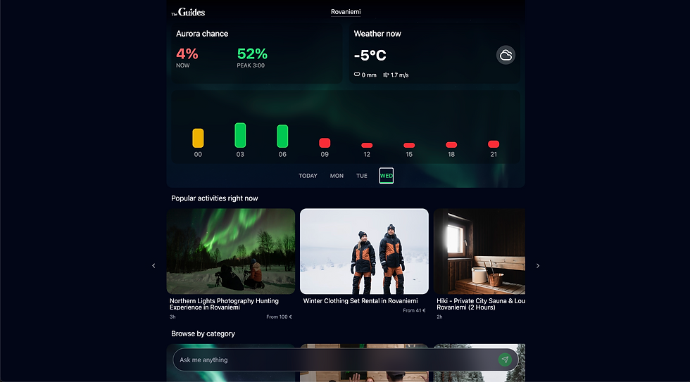 The Guides is an intelligent aurora guide designed for travelers in Lapland and the Arctic. It combines real-time aurora forecasts, smart alerts, local pro tips, and language-free guidance into one simple experience — so you don’t miss the magic when it matters most.